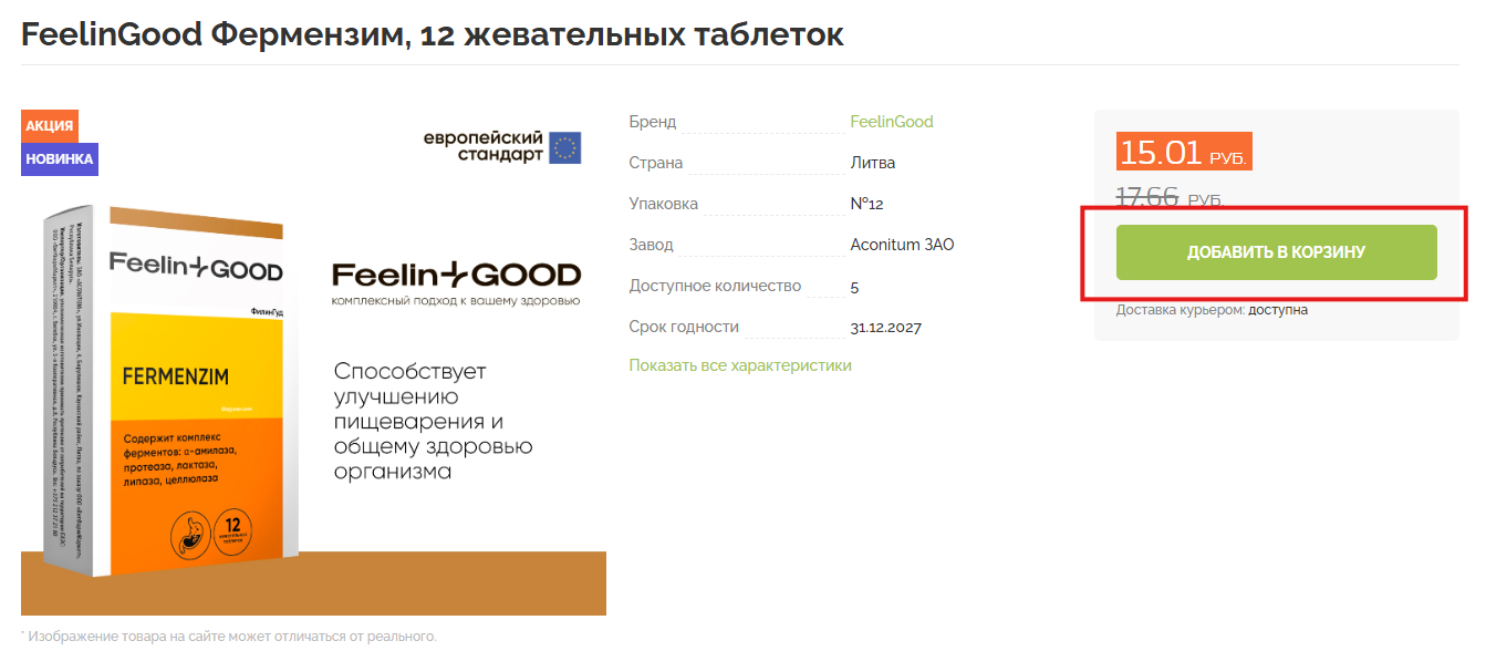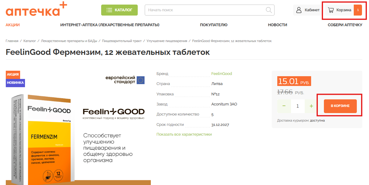 На странице товара вы можете ознакомиться с характеристиками, наличием в аптеке, аналогами и другой полезной информацией о товаре. Для заказа необходимо добавить товар в корзину, нажав кнопку "Добавить в корзину". Необходимое количество скорректировать можно в корзине.