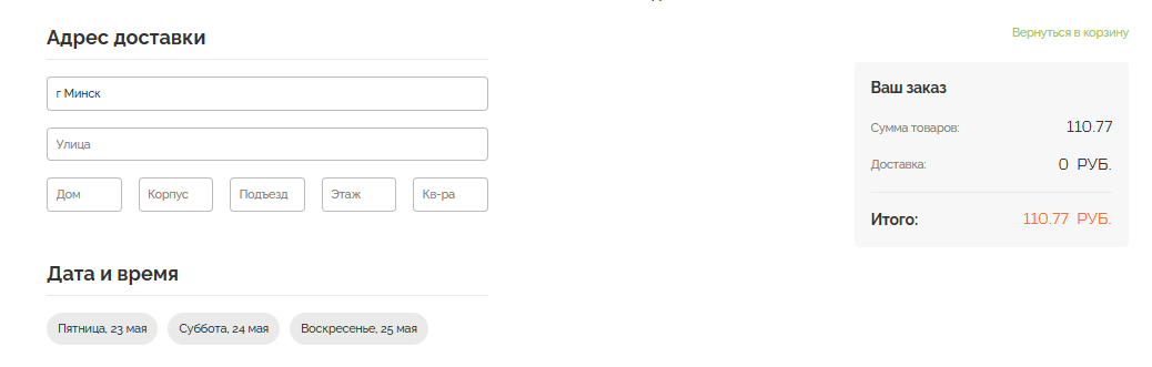 Введите адрес и выберите удобный день и время доставки. Выбрав день доставки, вам будут доступны для выбора временные интервалы для доставки.