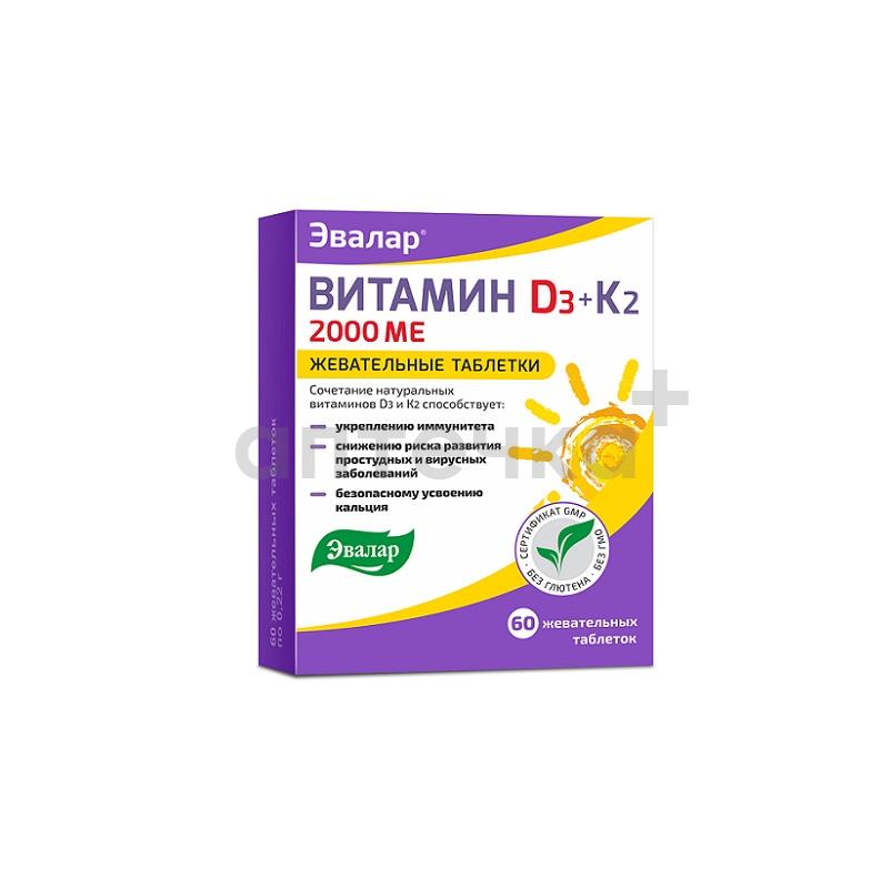 Эвалар витамин Д3 2000 МЕ + К2 рекомендуется в качестве биологически активной добавки к пище – дополнительного источника витамина D3, содержащей витамин К2, способствует: укреплению иммунитета, снижению риска развития простудных и вирусных заболеваний, безопасному усвоению кальция, препятствуя отложению в сосудах и почках, формированию и поддержанию плотной структуры костей, повышению силы мышц. Содержит популярный витамин D3 в высокой дозировке 2000 МЕ, усиленный натуральным витамином К2 в биодоступной форме МК-7, который дополняет действие витамина D3 и помогает ему лучше усваиваться. А за счет удобной формы жевательных таблеток усваивается еще лучше.