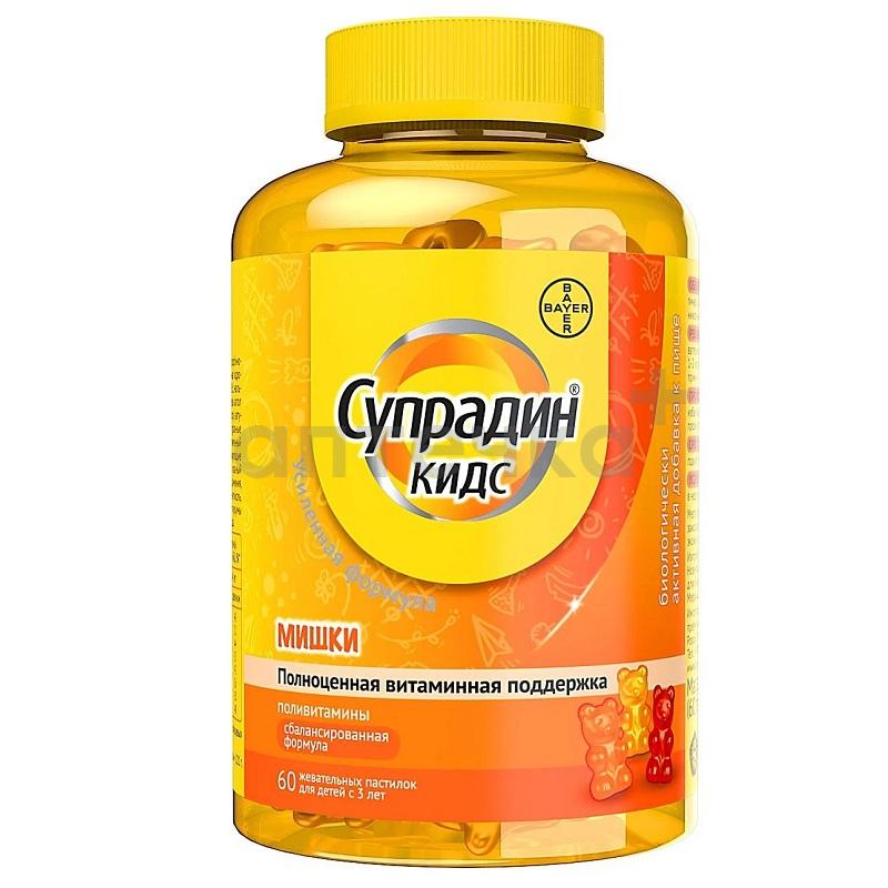 Супрадин кидс мишки рекомендуется в качестве биологически активной добавки к пище – источника витаминов А, D3, Е, С, В6, В12, ниацина, биотина, способствует гармоничному росту и развитию ребенка. Полноценная витаминная поддержка, сбалансированная формула.