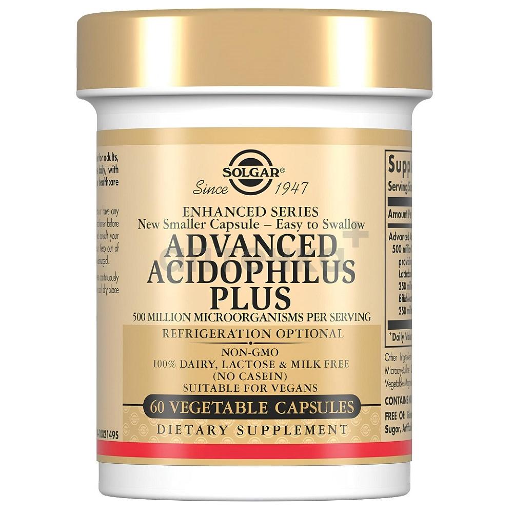 Ацидофилус плюс рекомендуются в качестве дополнительного источника пробиотических микроорганизмов (бифидо- и лактобактерий), рекомендуется для восстановления микрофлоры кишечника, способствует восстановлению и поддержанию баланса кишечной микрофлоры. Пробиотические культуры помогают улучшать пищеварение, поддерживают естественную защиту организма и способствуют нормализации работы желудочно-кишечного тракта. Технология двойного капсулирования используется для защиты живых бактерий (пробиотиков) от агрессивной среды желудка, обеспечивая их выживание и успешное достижение кишечника. Можно принимать людям с непереносимостью лактозы, не требует хранения в холодильнике.