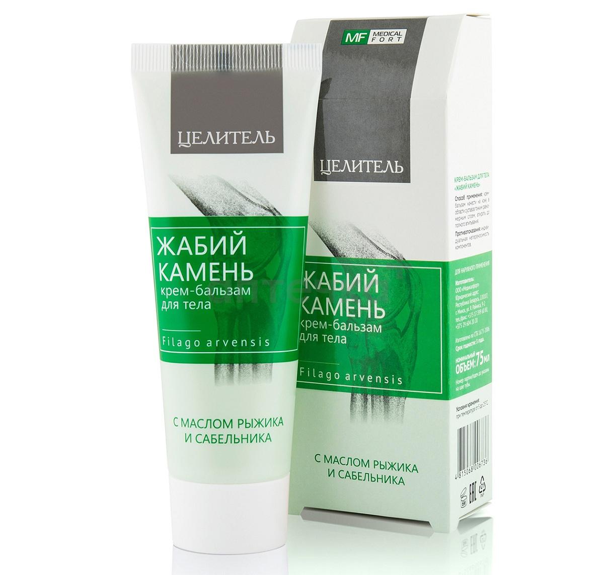 «Жабий камень» -специально разработанный бальзам, в состав которого входят жабник, масло сабельника, масло семян рыжика и другие полезные растения, которые широко используются в народной медицине. Бальзам на основе жабника представляет собой уникальный комплекс растительных экстрактов. Благодаря легкой и нежной текстуре бальзам быстро проникает в глубокие слои кожных покровов.