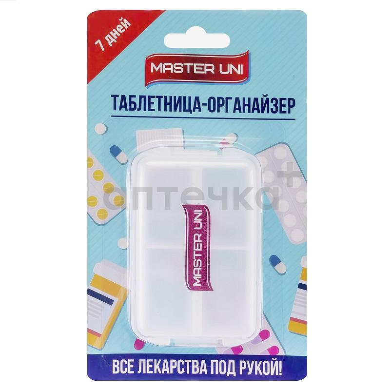 Пластиковая прямоугольная таблетница с 10 отсеками для таблеток с плотно закрывающимися крышками в упаковке блистер. Стостоит из 2-х блоков. Первый блок содержит 6 пронумерованных отделений, в каждое из которых помещается ежедневная доза необходимых лекарств или витаминов. Второй блок состоит из 4-х отделений, для распределения лекарственных средств или витаминов в соответствии с суточным режимом приема: утро, день, вечер, ночь.