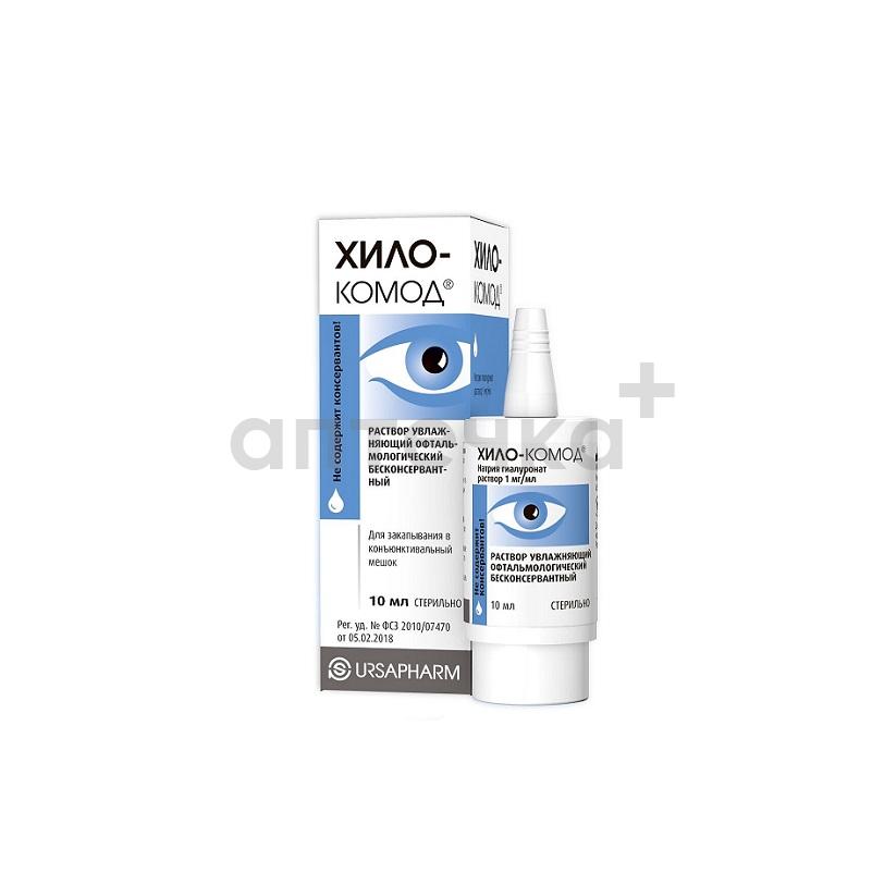 Капли ХИЛО-КОМОД предназначены для увлажнения поверхности глаз при ощущении жжения, «сухости», чувстве инородного тела, песка, рефлекторном слезотечении, раздражении и усталости глаз, возникающих при воздействии дыма, ветра, ультрафиолетового излучения, кондиционированного воздуха, после длительного просмотра телевизора и интенсивной работы за компьютером, а также после офтальмологических операций, травм, ожогов, повреждений роговицы, при ношении контактных линз, возрастном и фармакологическом синдроме «сухого глаза». Капли образуют на поверхности роговицы равномерную, сохраняющуюся в течение длительного времени увлажняющую пленку, которая не смывается при моргании и не вызывает «затуманивания» зрения.